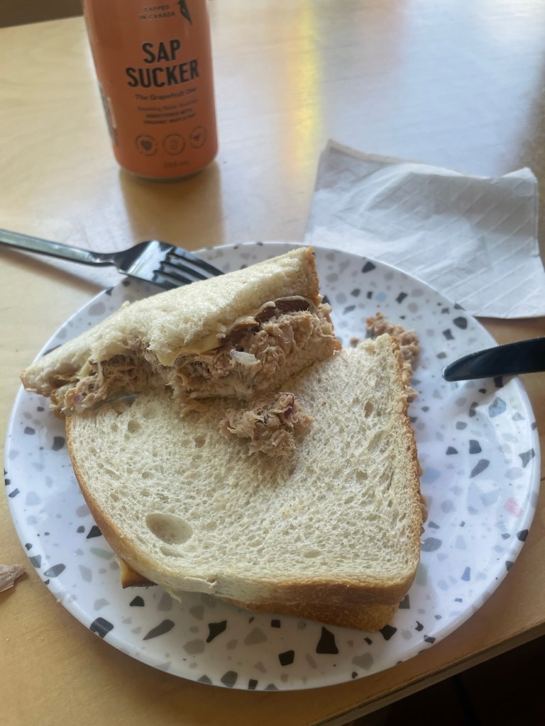 Back to the goody goodness, it comes in the form of a decently impressive espresso tonic, thanks to Kim’s soldiering on through capitalist hellhole that the coffee service industry can bring. Nonetheless. Here at what I think is Cosmos Cafe, I give it a 6 or 7. Paris France’s offerings may never be defeated in this respect. This one right here is kinda, sorta a little more standard version of one but I’m glad it’s on the menu and I can verify that before walking in. I can’t tell you the amount of times I’ve walked into a place wanting an espresso tonic and then just got something else when they didn’t offer one. Because I can’t count higher than ten. Maybe I missed the opportunity to find a good one in Montreal… I shall continue searching menus worldwide for these rare and refreshingly tasty thangs of all thangs. Get you one. Oh. Meanwhile Chad’s munching a 50% off salad that Kim was able to upsell him once we could hear each other again. And he is still celebrating his poop game hard.