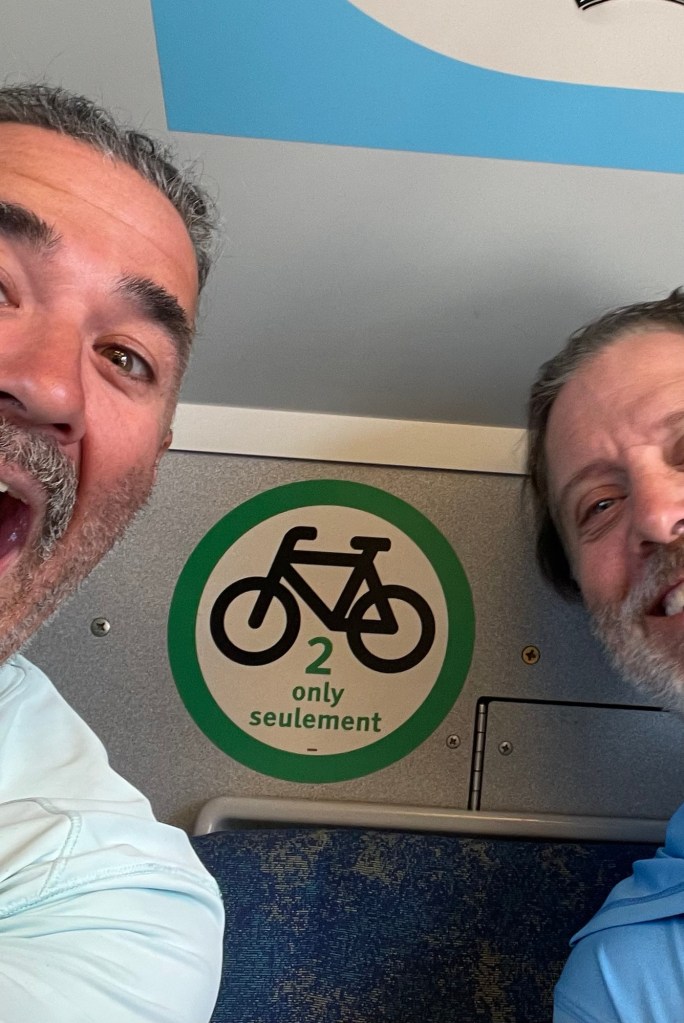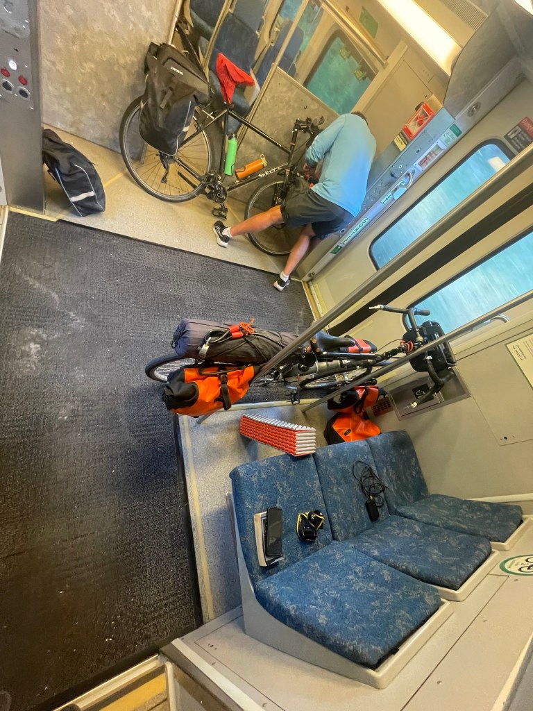I nosh the Vietnamese sammich hard as we approach this train time with trepidation. More uncertainty and/or contradiction manifests for boarding process and train cars allowing bikes and what not. Henceforth something something something. So I have never been on this train. I go and scout out elevators for various platforms, hoping the 8 minute lapse between track announcement and arrival is enough. Kinda depends on how long it sits in the station before rolling out. Ultimately it’s little sweat and we get on just fine. Occupying a weird amount of space by the doors but sitting right next the correct insignia.
