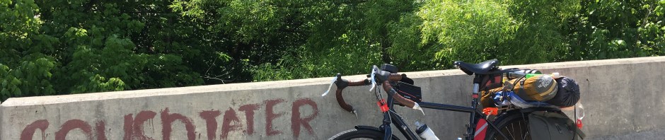 Route 62 is a lot of up and down, up and down; a bit less maintained; and has zero shoulder. But traffic is light outside of towns and most everyone is patient until they can safely pass. Some dudes working on the toad give me the bull horns and I can make out one dude mouthing the words, “fuck yeah”. One ass hat of a motorist give me the 8 second long horn as she passes. I wonder what she’s so pissed at, since I clearly can’t move over any more. Maybe she just hates bicycles or tents or tattoos. Or herself. I conclude it’s the last one, so I wave at her as she burns away more dinosaurs, speeding further into her own depressed existence.
