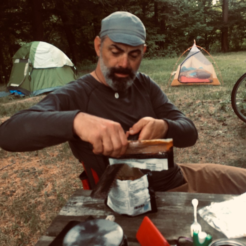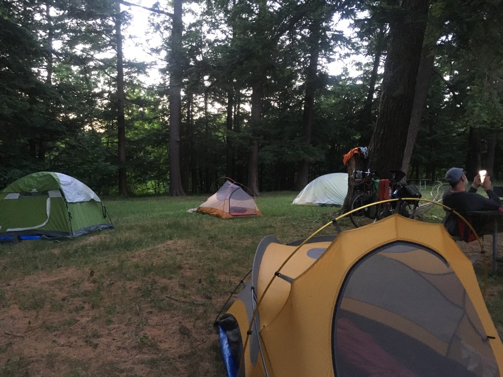 After the ice cream we slowly roll a few more miles to the Herkimer House. We decide to set up camp here. It’s fantastic. Daniel pulls out a machete, so I chop wood. We light a fire to keeps the bugs out. I get my campsite mixology on and whip up some ginger honey rum cocktails, when I pass it to Daniel, I look over to see him swing and chop open his packet of gourmet Himalayan lentils with the machete. Yesterday it was linguine Alfredo or something. I annoint him the Gordon Ramsey of herkimer house. For shits and giggles, I point to the dried pistacho drips on my shirt and yell at Chad about how these ice creams stains are mine and how possession is nine tenths of the law and so he better back the fuck off. Chad – who is a high school English teacher – just stares at me blankly, my passion for a good old weird time clearly going over his head. That, or being on summer vacation means he’s tuned out my childish antics. You can decide for yourself. After some chatting and eating and a drink and almost 80 miles today, I am ready to check out of the waking world well before total darkness. I lay down and between the trees above my tent I make out the Big Dipper in the evening sky. Happy face emoji.