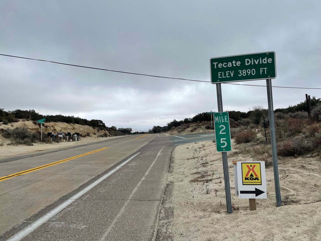 After lunch, we’re in Cleveland National Forest and reach 4,200 feet of elevation and I’m fixating on the dropping temperature and increasing winds. One might call it concerning. I get a weather notification about a High Wind Warning. 20-25 mph sustained winds with 50-60 mph gusts. I’m going to call it down right alarming.