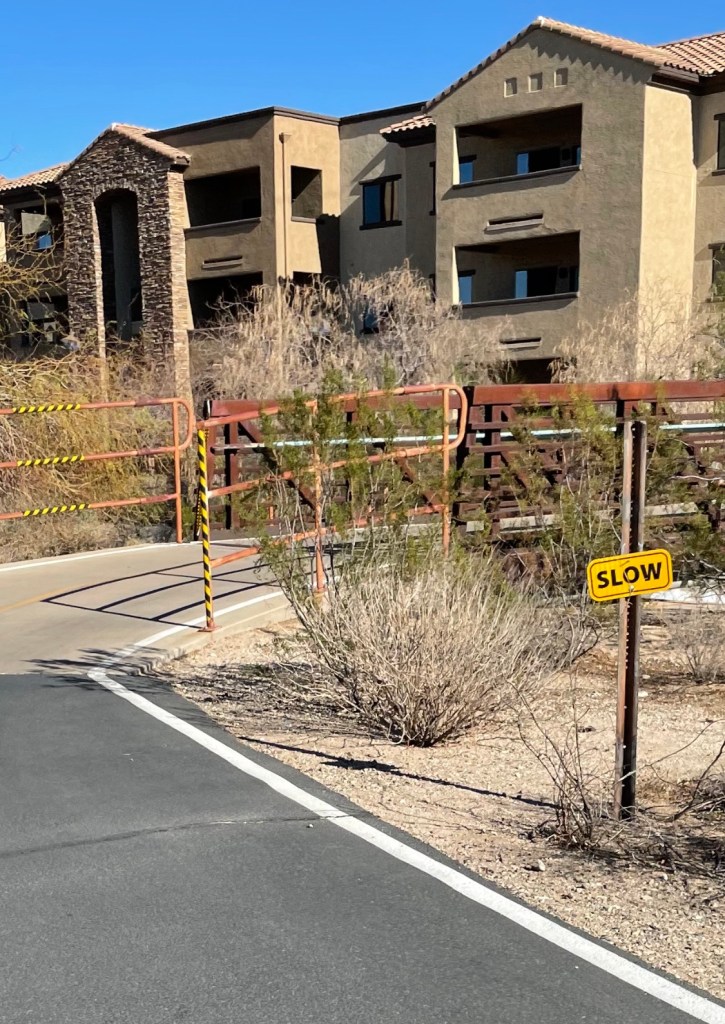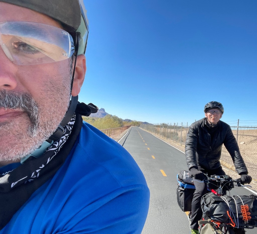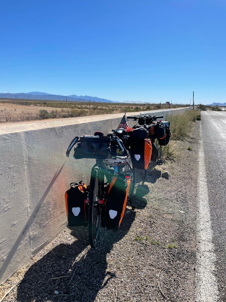 Thirty miles down the Camino Adelante. Aside from a few bumpy patches, El Camino was fantastic, even by non Arizona road standards. It runs parallel to I-10, so Damon and I roll together and maybe 20 vehicles pass from behind for the hours we’re on it. We chat about universal basic income and corporate tax rates, because. We take another guardrail rest stop. The desert sun and dust has weathered my face and lips sumfin fierce. Dry and cracked and dehydrated – I feel like Tyrone Biggums got lost in Yemen or something – and we’re still another 15 miles from anything at all. Despite the lack of shelter from the sun, it’s a good time and space for a break.