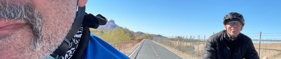 Thirty miles down the Camino Adelante. Aside from a few bumpy patches, El Camino was fantastic, even by non Arizona road standards. It runs parallel to I-10, so Damon and I roll together and maybe 20 vehicles pass from behind for the hours we’re on it. We chat about universal basic income and corporate tax rates, because. We take another guardrail rest stop. The desert sun and dust has weathered my face and lips sumfin fierce. Dry and cracked and dehydrated – I feel like Tyrone Biggums got lost in Yemen or something – and we’re still another 15 miles from anything at all. Despite the lack of shelter from the sun, it’s a good time and space for a break.