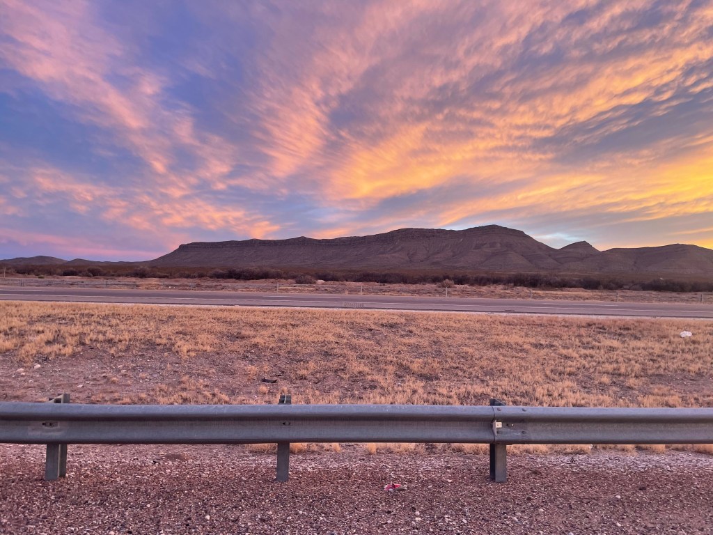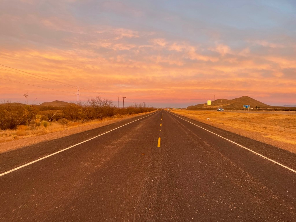 It’s a getting later in the day, but despite the luxuriously dust flat section of dirt we’ve graciously been granted by Don Julio — I’m serious, the cashier addresses him as such when procuring permission — we make a snap, post-burrito decision to keep going. 22 more miles until the next town. It’s turns out to be uphill and a little upwind. And the first chunk of it puts us back on Interstate 10. My old nemesis. Like a toxic relationship, I just can’t give up the 10 even though I can’t stand it. It sucks once again, two states later. I’m pedaling and breathing as hard as I can; I’m only moving 7 mph as trucks whip by. As the sun begins to sets, we jump off and cruise down a frontage road. The sun, which has been behind clouds all day, dips out below the clouds yet above the mountainous horizon. It yields a spectacularly impressive light show, unlike anything I’ve ever seen. No filter needed.