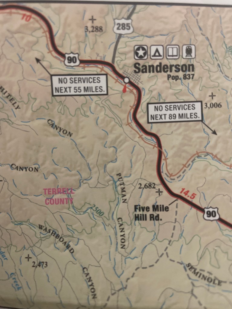 Feeling about ten pounds lighter, I get through the 55 miles of zero services into Sanderson, population 837. Twice the people as Marathon but one quarter the things; this is the only location with water and toilets and phone service for about 145 miles. They have two motels and a gas station store — so it will have to do. No groceries. Their one restaurant is only open two days and today is not one of those days. We are about as far from the typical gas-station-every-few-miles world that is typical across the US and A.