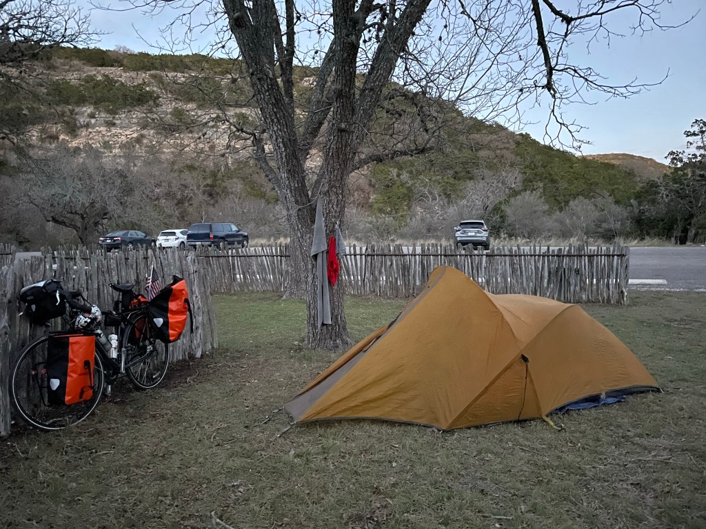 This place is fantastic. Five stars for sure. They are most definitely completely full, though the Texas Parks & Wildlife folks here are familiar with bicyclists coming through unannounced. They roll put the red carpet for us. The woman at the office comes outside, let’s us know of the special spot just for those on bike, informs us we can use the campground showers, and that we can pay the fee in the morning. This familiarity with our situation extends to another park employee and another and another. It’s refreshing to meet folks who understand enough of what it is that we undertaking and to make concessions for us.