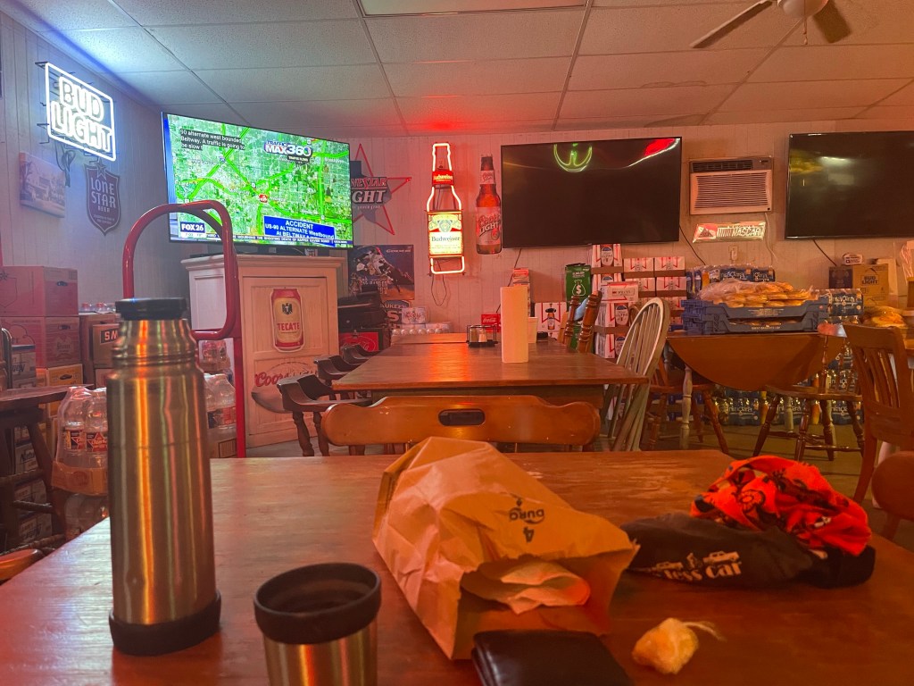 Rainy morning in Independencea TX and I’m absolutely annihilating these bacon egg and cheese biscuits that Mike sells me. Mike owns the general store. And the restaurant attached it it. And the land we camped on last night. Mike is the motherfuckin man actually. It’s his world, and I’m just a squirrel trying to get a nut. In this case “a nut” is coffee and breakfast and shelter from rain. Mike got me. The 60” TV in the restaurant tells me that’s it’s Friday. That storms are coming. That Houston rush hour traffic has eased. That some dude was arrested after shooting his mother in law to death. Jeez, the information started out useful and went downhill from there. Then the local news gives me a whole minute long segment about “using your dog to get dates”. I definitely want a dog but hesitate as to whether the second part is useful or ethical for that matter. Whatever. I crush two breakfast sandwiches and head out to see if the rain has broken and if Damon is out of the tent yet.