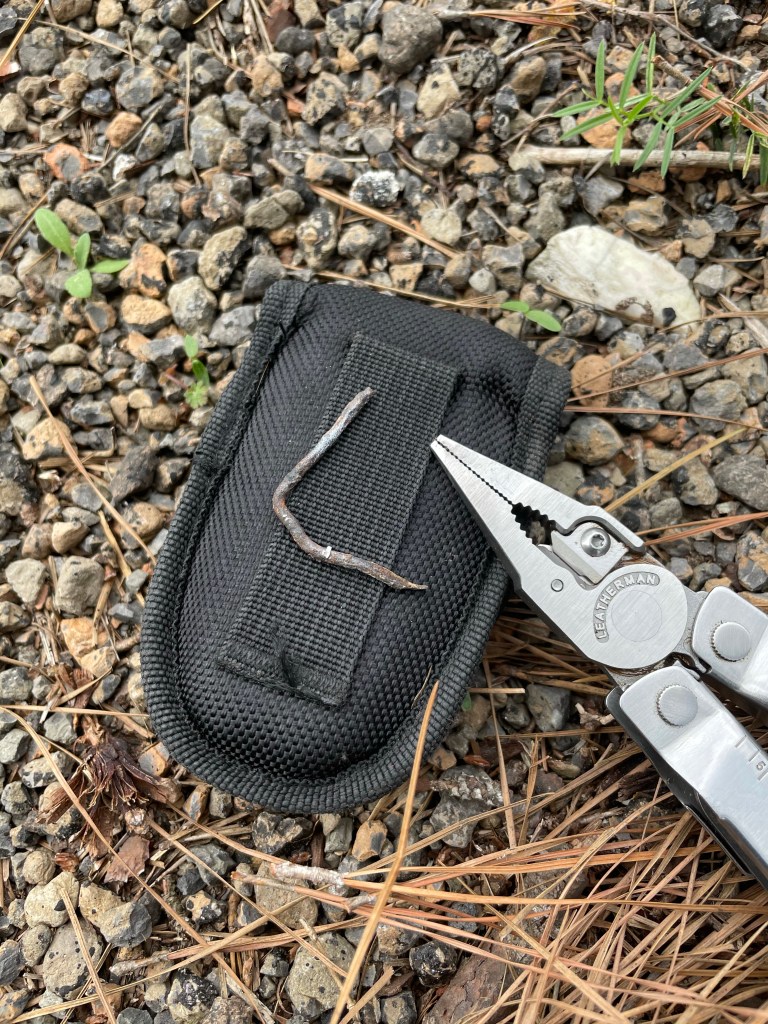 About 55-60 miles in and Damon gets a clinking sound out of nowhere. It’s strange. We pull off and it becomes clearer what’s happening. This farm road provides the grounds for an onslaught. Like some entry and edit wound shit. One entire inch of this metal shard is burrowed into his tire. I yank it the fuck out. It has literally made two holes in his puncture proof tires. I use some tape as a boot, Damon pumps back and we roll, but go ahead and have a look see at this unholy thing, half of which somehow ended up buried into his tire and tube.