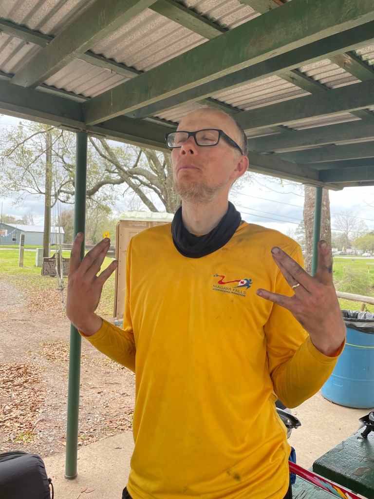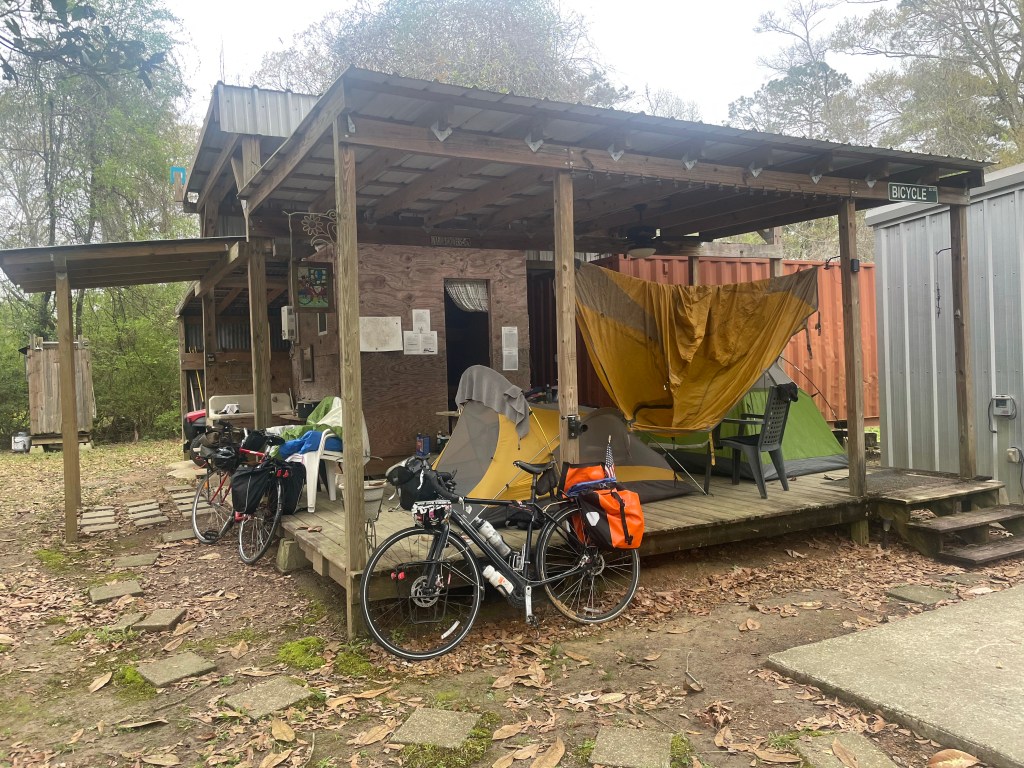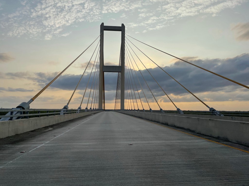 We’ve been discussing a shortcut. First Damon and I. Then with Mandie, who admits she doesn’t bike but has heard there’s a bridge you cannot do on bike. I float the idea to Perry – an amazing host and friend I made the day before hitting the Natchez Trace in 2019. Her and Lep are kinda sorta bike touring famous. Or maybe bike hospitality Jedis. Maybe it’s Perry and Lep just goes along with it. Anyway. Perry confirms that there is indeed an absolutely un-rideable 5 mile bridge over land and is telling me about a detour that she says is only for “the smart cyclists”. It’s via private road, though the owner is cool with bicyclists using. If nothing I drop Perry’s name. For reals. Her and I laugh and I hope to see her on their wonderful stretch of land if we can avoid the storms supposedly heading our way.