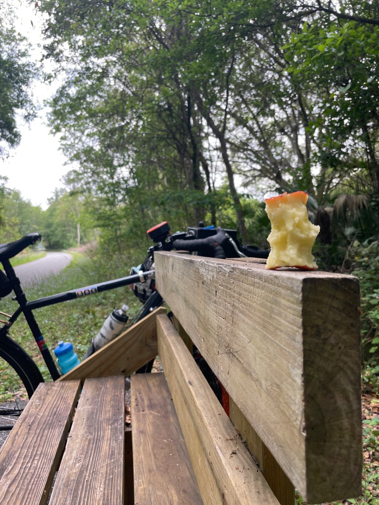 I win a game of chicken with a butterfly. Then I lose against another. You win some you lose some is what the boomers say. This day worth of rail trail feels like the C&O and GAP Trail from DC to Pittsburgh. I pass streets with names like Carter Crabtree and Cracker Swamp. Rest stops. Quiet times in small towns. Snacking on an apple make the world go round. What’s the over/under on how many minutes until the core becomes a squirrel’s feast?