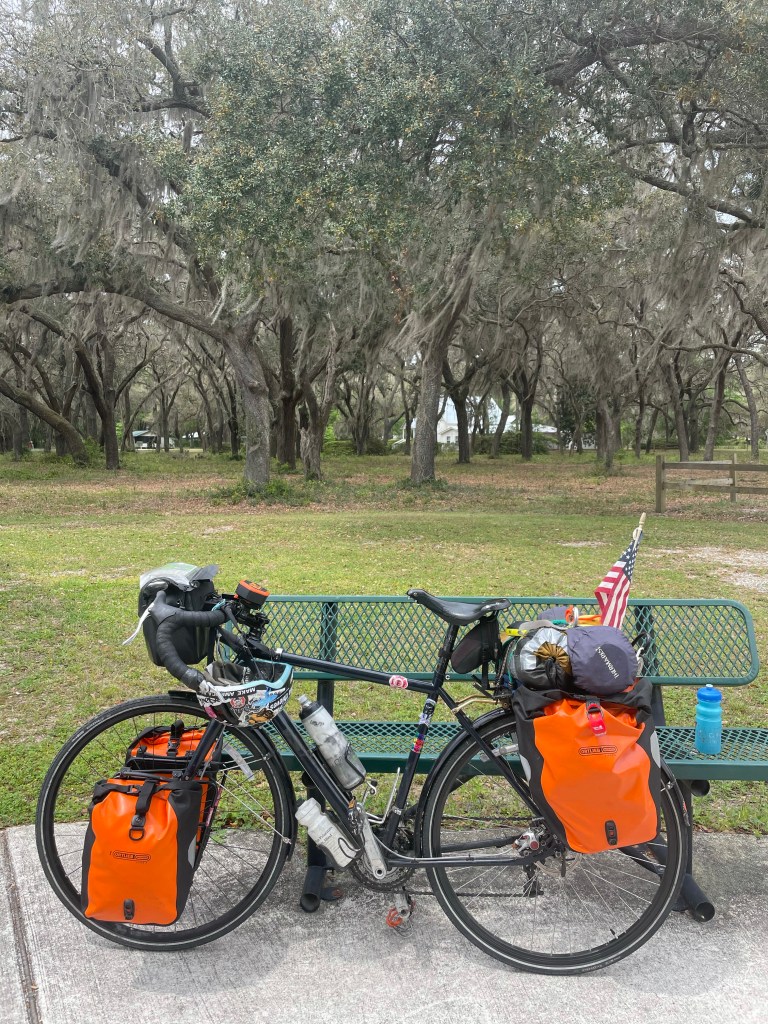 Later in the day I am greeted in the route by Rob and his dog Blanca. Rob is riding the southern tier east to west in segments. Today is their first day out and they’re going to Biloxi on this segment. There. See how easy it is to use there, their and they’re correctly? This makes the list: Nick, Jim, Chelsea w/ Taj, Justin and Rob w/ Blanca all on the cross country route. Not nearly as many as I met ten years ago on the Northern Tier, but exciting nonetheless.