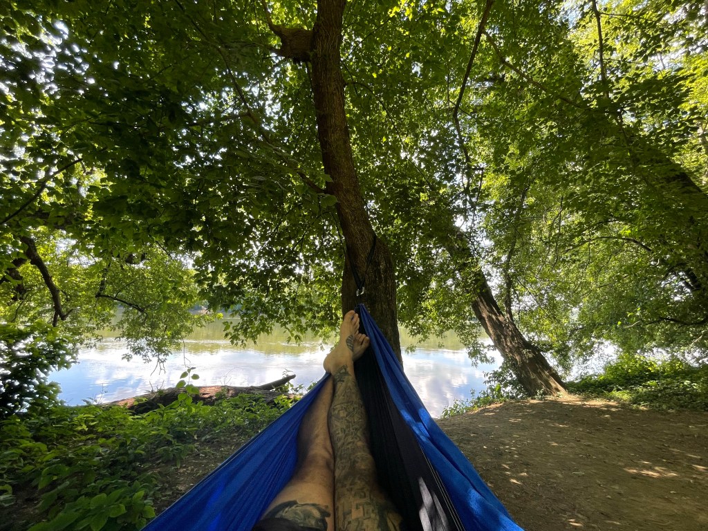 The natural high of naturally being in the natural world returns quickly and I’m right back where I was at in the last leg of my 3,000 mile romp with Damon just a few months back. I could ride forever. Responsibility be dammed. Never mind that I literally just purchased another piece of property last week. Nor that I’ve got that whole career version of a winning lottery ticket back home. Speaking of which, it’s hottern hell out here and midday is upon us. I’ve got dust all over my face and it’s time to find a swimming spot. Easy to do along this trail. Afterward, I put up my hammock between to shady trees along the bank. Swaying in the breeze I clear my mind by thinking of all the things I’m not doing right now. I’m not checking emails. I’m not performing CPR. I’m not responding to texts. I’m not fixing a broken toilet. I’m not on a ladder with a chainsaw outside of a commercial garage engulfed in flames. I’m not even riding my bicycle right now. None of those things. There’s so much I’m not doing. I’m proudly in a present partnership with procrastination.
