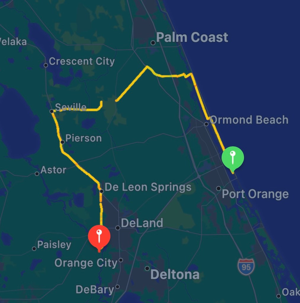 With civic vitriol the highest it’s been in my lifetime, I cruise northbound toward my turn inland. My time in the ocean limited, I’m focused on a state park on an island requiring a ferry ride. The last ferry leaves an hour before sunset and is 80 miles away. I’m leaving the beach life behind; the wind has shifted AGAIN; I now have a 12 mph tailwind. Yay! Yet. I’m basically going north, then west, the southwest, then south. So yeah this means headwinds soon come. The route looks like this: