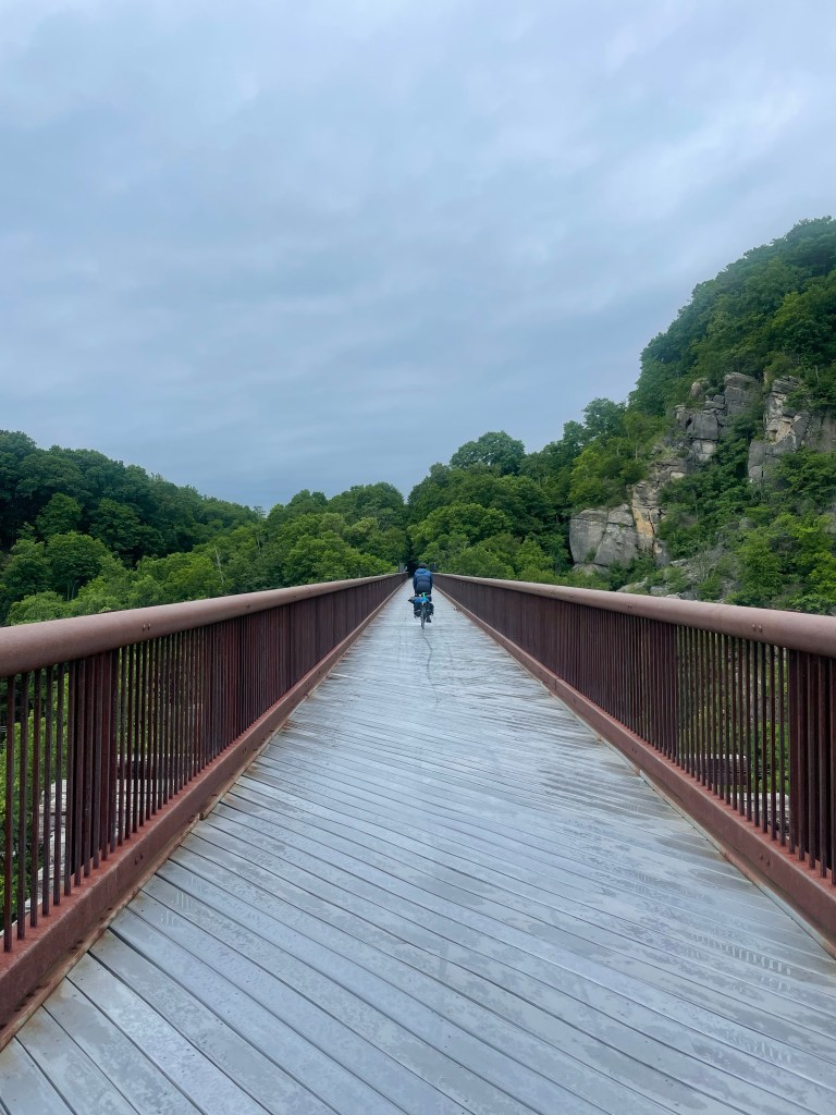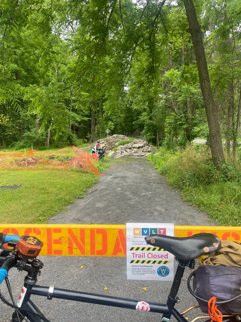 We sneak out after an hour and the first five minutes are great. Then yeah, more rain. I’m pretty wet now. The trail runs out but the rain intensifies. Back on the road with this downpour? No me gu —-fuckin car almost a clips me! What the fuck asshole. He’s in a hurry to get to the next red light i guess. This sucks. No sir I don’t like. Crossing the Hudson out of Kingston is one of the most precarious bike tour feats I think I have pulled off to day. It’s especially fun when construction signs next to orange cones in the bike lane squeeze me out into traffic on a bridge in the pouring rain. I skirt out, grab the cone and drop it behind the sign, making more room for Kara and Damon somewhere behind me. I’m another second I’m taking the lane because of the signs this construction predicted. Comes constrict both lanes to minimal skinny. Did I mention it’s Monday lunchtime traffic? 80 mph traffics now moves at 8 mph behind me, in the middle of the lane. Fuck it and fuck you. Rain dumps on me from above as i make my way over the waters of the Hudson below. Never mind the debris everywhere and the hydroplaning water running alongside it all. This one was not for the faint of heart.