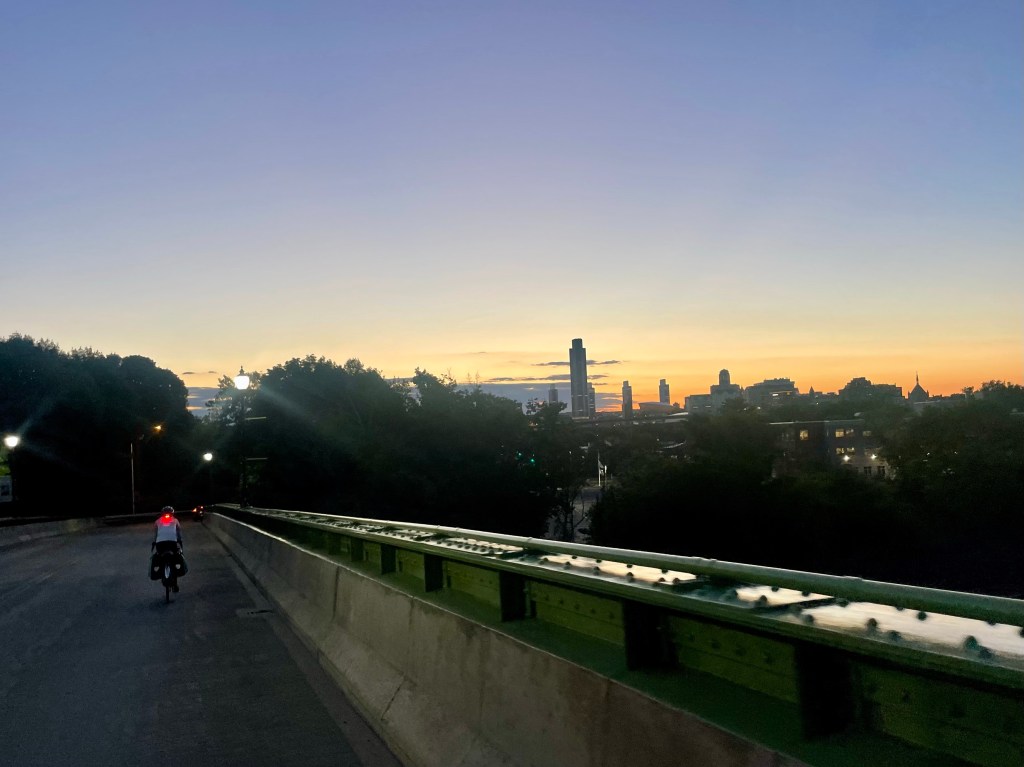 After 20 more miles in now sun filled skies I’m feeling it. Rubber legged. I hit 41mph and Supertramp’s “Breakfast in America” is on the playlist on my way back up when the combination of enduring the pain and ignoring the pain does me in and I black the fuck out. “Watch what you say or they’ll be calling you a radical, liberal, oh fanatical, criminal.” Like my mind takes over and is no longer concerned with joyful musings or intellectual awakening or deep thoughts of any sort. Not even more the basic thinking’s. Only the critical parts of my brain are turned on. No recollection of another 40 miles. Straight autopilot, basically. I can’t feel. Numb. That’s pretty much all I know. Golden hour glimpses of chasing the sun. Flashbacks of riding in the darkness along the Hudson. All muddled with pain. Pain in my ass. In my knees. My elbows. Knees. I definitely can’t feel that headache anymore.