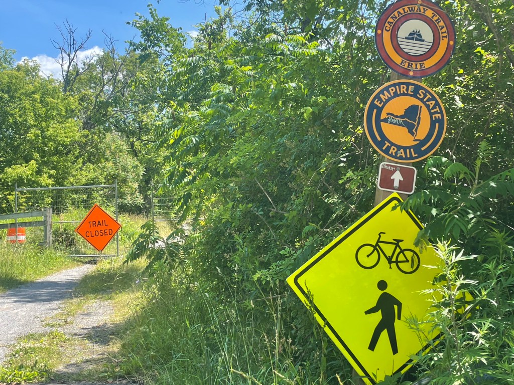 Contrary to the lies my teacher told me only some roads go to Rome and the Erie Canal bike trail diverts from the Erie Canal and goes right through it. On motor vehicular roads which are poorly signed for the “Empire Trail”. Horribly signed in fact, Howard Zinn. I suspect all that trail money got spent up between Albany and New York City. Buffalo’s end of it got corrupted away via the 16 year fiasco we call reliable elected leadership. We resist the typical onslaught; country home cafes, Eddie’s (or someone’s) Diner, hipster noodle joint… Damon is convinced something is gonna be named after the coliseum. We’re cruising out and there it is — no whomp needed — Coliseum Pizza. We nail the dismount and trek forward, toward the return of the stone paths and Carie’s