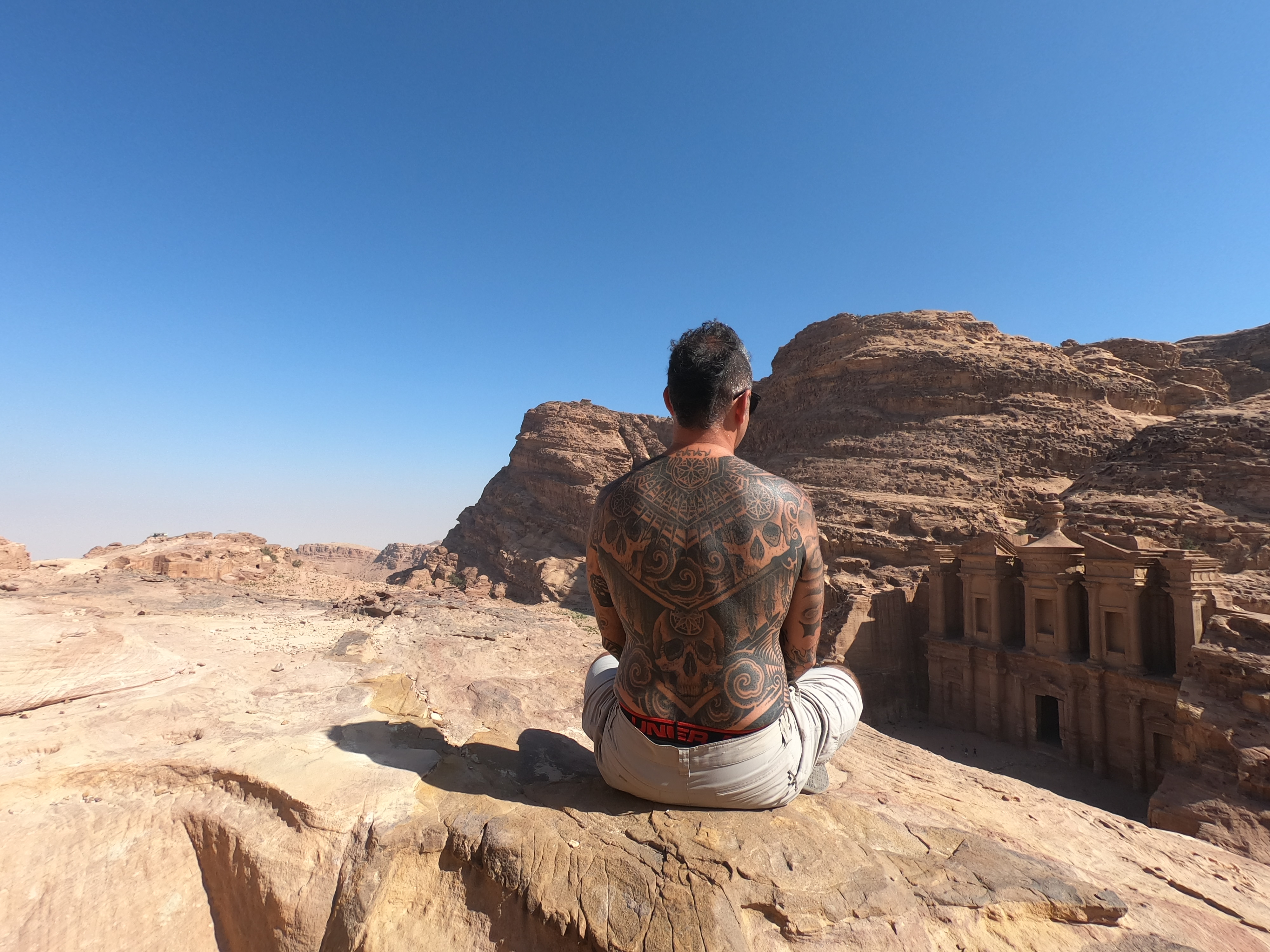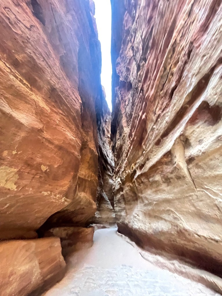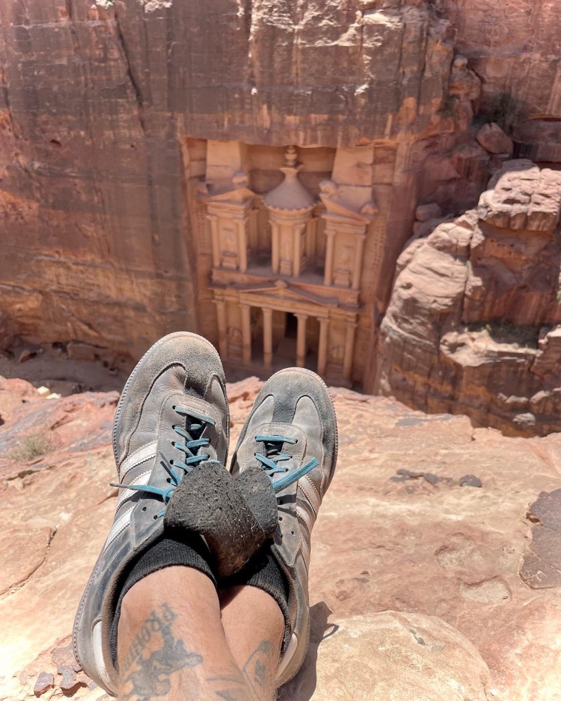 I trespass to “The Treasury”, Indiana Jones be damned. Petra is part Disneyland and part Desert Solitaire. Populated long before anything we know as civilized, left for dead and then unearthed only to be ruined by the quest for “likes” and the search for social media currency. Ruined by the gram. Or at least the concept of “influencers”. To capitalize on this ridiculous trend, Jordanians have built a cafe at the best viewpoints. I’m not here to buy, like I said. Respect the pilgrimage. There’s no signs keeping me out. I sneak around the purchase point, climb under a rock on my belly, tear my shirts and get the shot every basic Betty dreams of. Well shit if my grandmothers name wasn’t Elizabeth I wouldn’t have this photo. I need to get some free gear from adidas while I’m at it. Instead I get yelled at in Arabic. Fortunately, my giving-a-fuck in on vacation too.