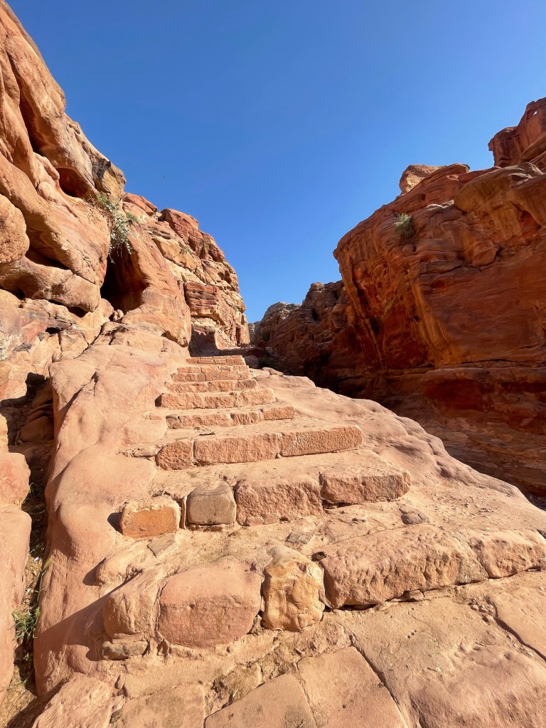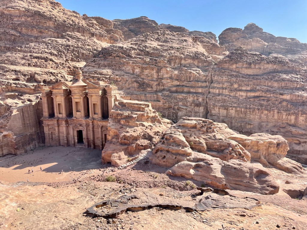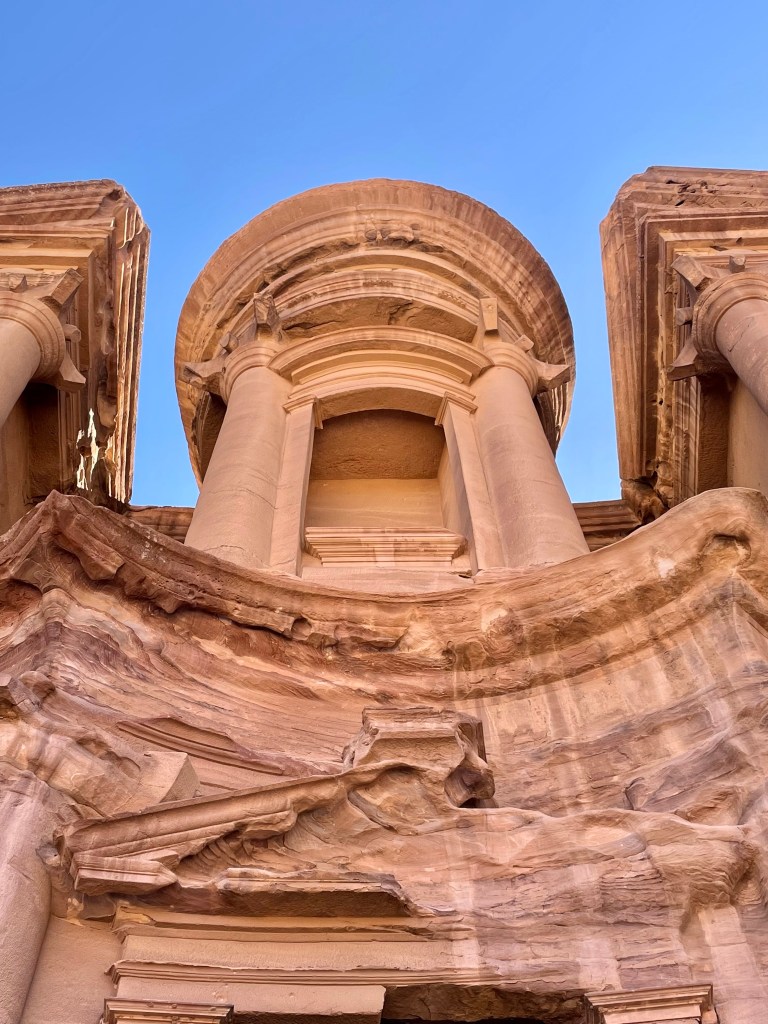 The best spot in all of this middle eastern wonderland is Ad Deir. The Monastery. Little kids huff and puff. Old folks get on donkeys. It’s a climb. Once up I’m blessed with this 150 feet high and 150 feet wide 1st century structure. This monumental building carved out of rock is as old as Christ — but never left us. Take that Hay Soos. The huge facade, the inner chamber and the other structures next to it or in the wider area around the Deir originally served a complex religious purpose, and then was repurposed as a church in the Byzantine times.