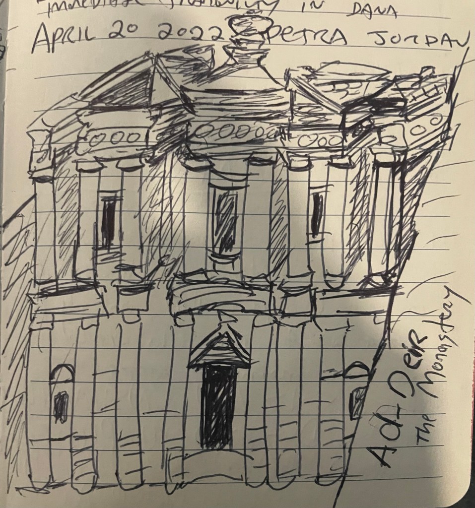 A full year of travel allows me to go deep into what specifically it is I look for and love in cities. What’s at the core. What floats my boat and finds my lost remote, so to speak. It’s a process still in flux, and I suspect once arrived upon, this may end up as an entire entry. For now, I acknowledge that few places have given me so much opportunity to think and speculate and ponder as the historic and archaeological city of Petra Jordan. The area now known as Petra has been inhabited from as early as 7000 BC, and the Nabataeans settled in what would become the capital city of their kingdom as early as the 4th century BC. So somewhere between 6,000 and 9,000 years of humans human-ing around these here parts. Yet it’s mostly a mix between a National park and an ancient excavated site. I can sit in a cafe along the main road and I can free climb up above the carved stone structures. Mostly I hike and think and write and drink water. I keep it simple. I’ve got a 3 day pass and I knock out something like 20 miles hiking and climbing in one day alone. 10 miles another. It’s fantastic. I cannot recommend a visit enough. Much of my recorded words revolve around fleeting thoughts and random happenings, though I do manage to get some good sketches done and take a ton of photos.
