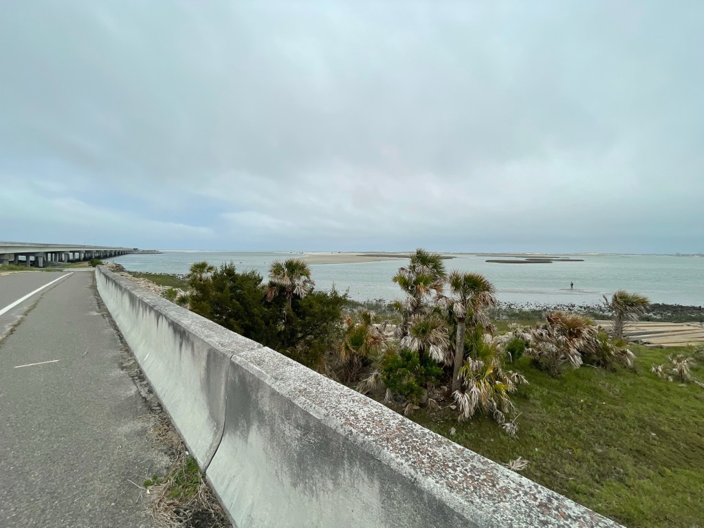 A few more miles up; Blackalicious and the White Stripes contrast sounds in my ears like the actual contrast their names conjure. Landscape changes always enthrall me. The pristine white sand beachiness gives way to green wet marshy funkiness. James Brown and Open Mike Eagle are hitting hit hard. The air is crisp and the wind is whipping but hell yeah this is that feeling. The good good. It come straight away now. Back in the saddle.