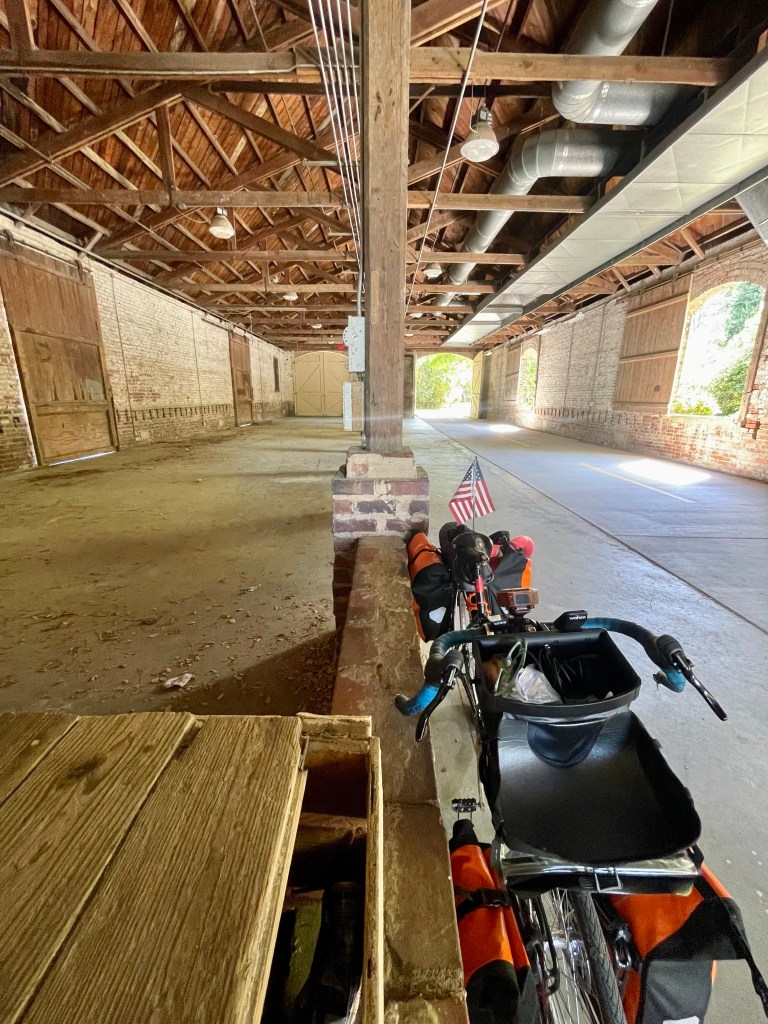 For shits and giggles, let’s hot tub it up this morning and timespace travel forward to when I’m spending the later afternoon in the shade of a train depot. I’m weighing my options. Like scales of justice. There’s an ice cold water fountain within eyeshot; I’ve filled my bottle threefold already. I decide I’m gonna flip the power lever on this box and hope for the best and whaddya know? I’m chargin my phone, whilst I’m on it. Weighing. Not literally – wait does the iPhone do that yet? Nah, I’m figuring where I want to sleep. I never plan these rides out much beyond the day to day. Ruins the fun. I could probably never do an organized tour. I’m looking at distances to my various possibilities. I’ve got good weather; I’ve got 35 miles of riding under my belt today. It’s getting later – 357 in the pee em in fact. This depot is super cool. Literally, old brick got the temp real nice in here. No more trains; just a hollowed out and preserved structure; old doors and windows; looks like it get used as an event space at times and I’m betting I could camp right in it if I wanted.