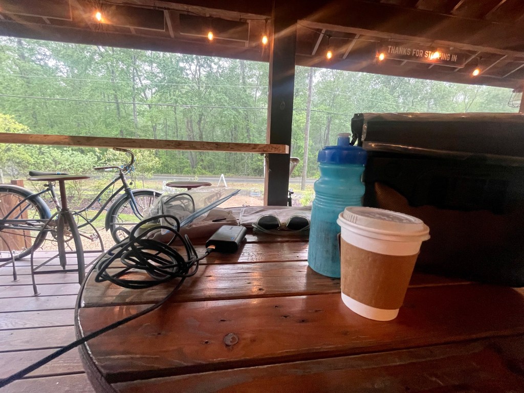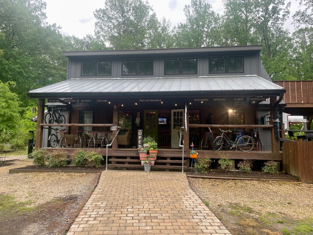 The Virginia capital trail is the truth. Three miles out of it from Williamsburg and I’m all up into it. The rain looks imminent. There’s lightning nearby. I’ve got experience being out on a bike trail in crazy weather. There’s typically no cover. Nowhere to run to baby. Or ride to. Tornadoes in 2010 Minnesota come to mind. Ive got a bad feeling about this Chewy. And whadya know, a dope provision shop right on the trail. “Spoke & Art”. I get a coffee. And a sandwich. I charge my devices whilst under a covered porch. There’s a couple live acoustic performers under a separate covered porch. Perfect. Not getting struck by lightning today.