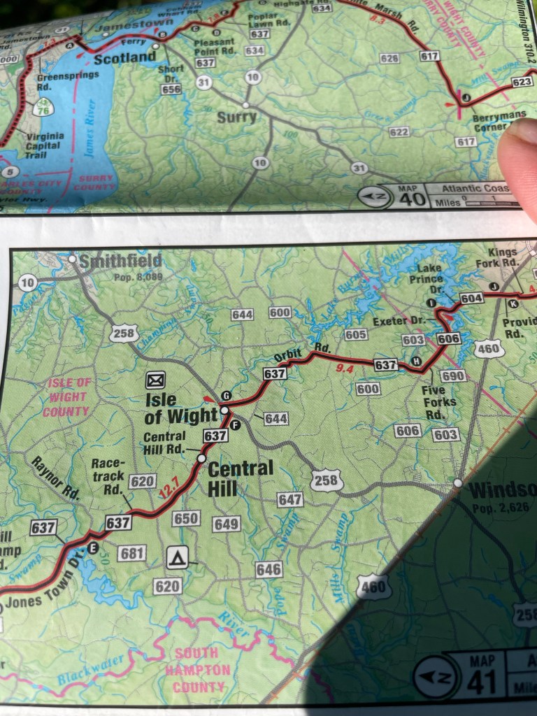 Virginia for lovers. Lovers of Hay Soos for sure — so many churches, crosses wrapped in white clothes. I’ve come a long way and I’m a lover of winding country roads — I’m on one right now. I also love cemeteries — little pop up plots everywhere. Isle of Wight just sounds creepy and weird and a little scary on a map and when I read it a sign. Now, there’s nothing even here and it’s even stranger. I mean nothing. Like not even the post office the map indicates. I manage to figure out a rest stop that doesn’t have a no trespassing sign, allows for rest myself and the sojourn.