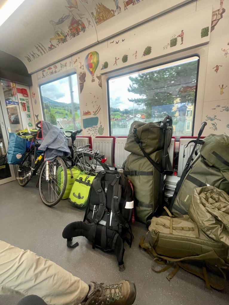 Yup. The ol’ two for one. A side and B side. A one two, a one two. Truth is I hit Zurich Switzerland for a quick three day trip with the audacity of a couple of world wars. AND. It’s a rainy day so I absolutely have to take a train and get to this tiny ass nearby nation known as Liechtenstein. Bucket list includes as many nations as possible prior to expiration. It’s a biiiiiiiiiiig fuckin bucket yo. Two things can be true at the same time. On this Swiss train. I mean, this thing is as baller as it gets. Can all of the things are true all be true all of the time? Bikepack gear space on the public transport kind of all and all and all. On and on. Check it out yall.
