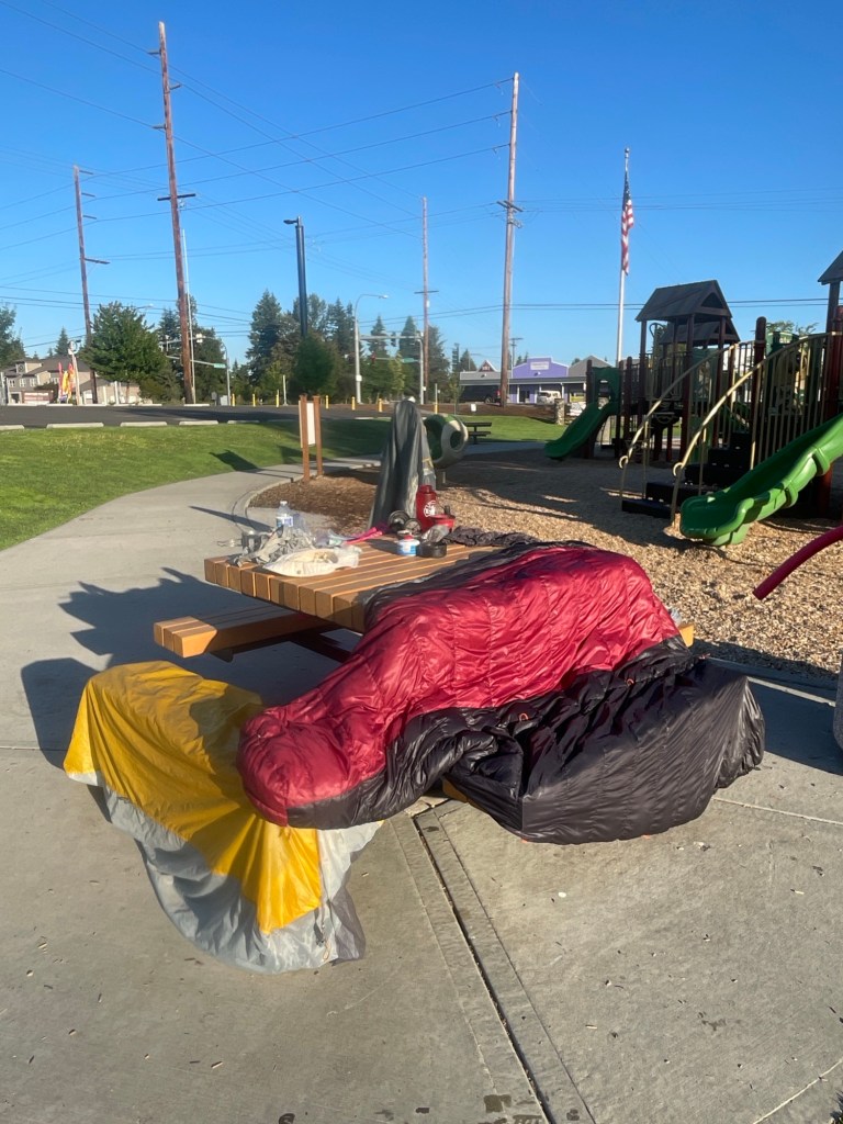 Morning finally breaks a soaked and chilled night and we’ve relocated to the nearby community center. I copped 2 hours of shuteye. Straight banked it. Now I’m brewing up a cup of that coarse ground. The DPW worker opening up the restrooms, after hearing our tale, proceeds to inform us that we got doused with “reclaimed” water, nearly straight from the sewage plant. “Poop water” he calls it. I’m calling him Pete. Poop Water Pete. Yum. We’re hanging at the picnic tables, trying to dry out and looking like some real hoboes. Smelling like them too. It’s quite a site I’m sure. I sip my coffee and fart.
