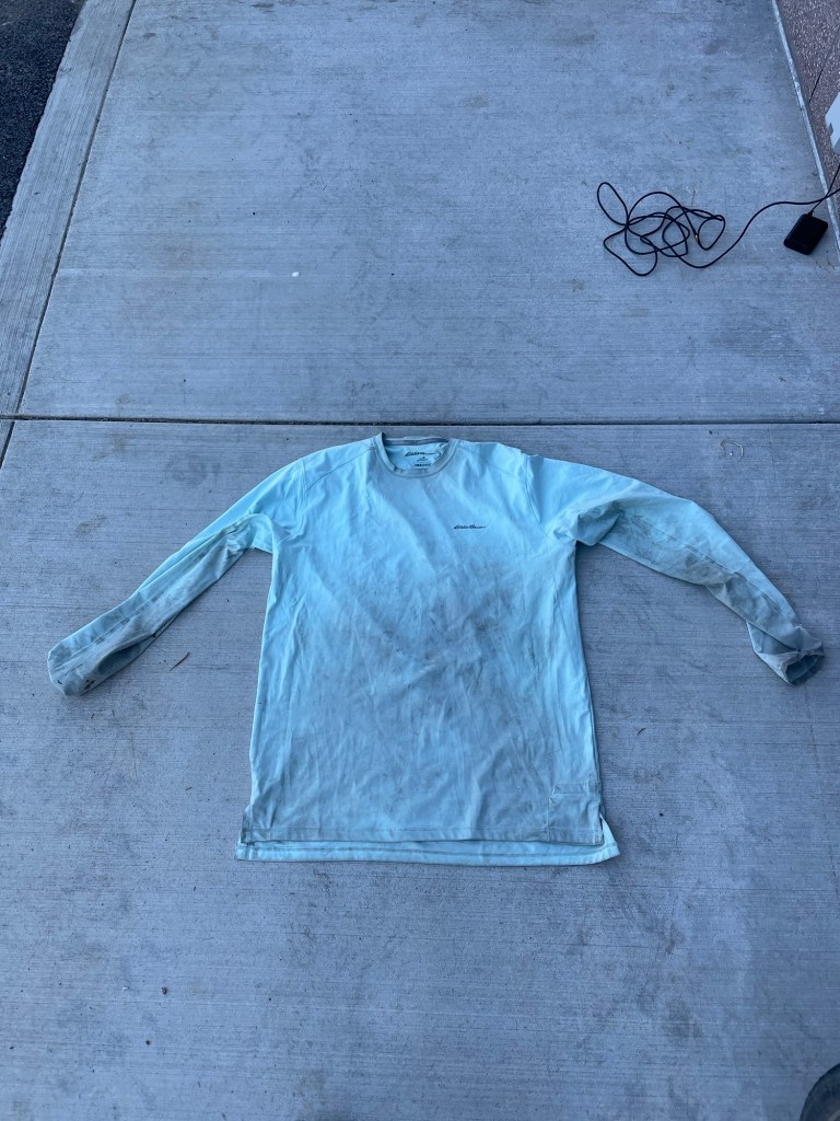 I’m thinking about this $85 Eddie Bauer shirt that I am wearing. They don’t pay me, I pay them. It is a nice shirt though. Lightweight. SPF protection. Long sleeve. Thumb-hole hand thingies. Worth it for sure. I have no before photo nor any wifi to download one, but here it is after 8 straight days. Not as bright. I’ll take another shot at the end. And then another pic after I wash it. One would think this designer name brand would want to replace it for me free of charge, a reasonable man would likely come to the conclusion that it shouldn’t be in this bad a shape after only one wear.