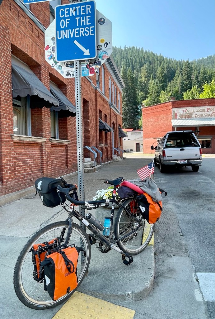Has there ever been consideration for a time traveling inflatable kayak that one can fold up and carry by bicycle? Like just get to water, punch in a date and time and go to wherever we want. Let’s go from late in the day to the early middle of the day. Right after second breakfast. Right after we meander through the Funky (and closed on Sundays) town of Wallace ID, near the end of this wonderful paved path — and apparently, the center of the universe. Gotta move on. To Montana.