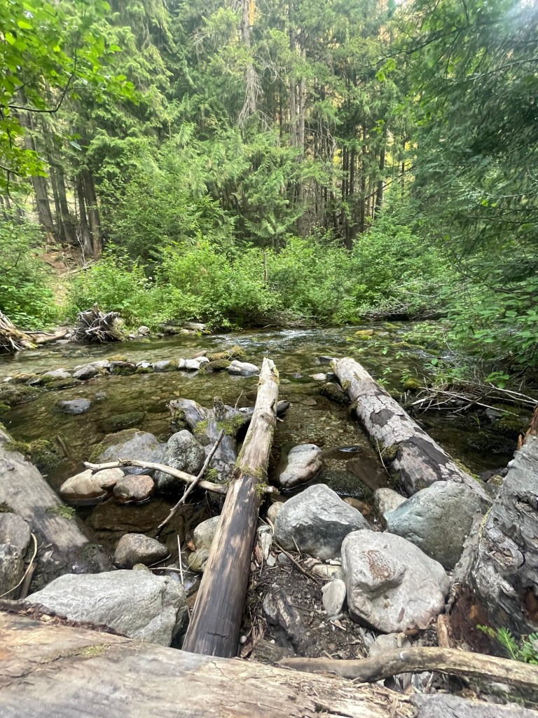 This intensely high level oxygen blends with the tranquil sounds of Deer Creek flowing mere feet from the front door of my Big Agnes bikepacking tent (they also don’t pay me) and a zen nirvana comes over something something. Nah for real, the best things in life are free. Like this National Forest campsite, Janet Jackson. My rear left pannier is now a bear bag hoisted 15 feet up a pine tree — all after we hoist ourselves up over 4,800ish foot Lookout Pass. Railroad grade once again is the shit. I said it, I meant it. Flashbacks of Emory Pass in 2021 mixed with the large loose gravel on the Palouse to Cascade Trail last week had me bugging. Today I climb a steady three percent grade with no motorized vehicles — and the surface was a good 7.7 out of 10. Borax Tunnel detour is now just a set of perfectly graded double switchback for cyclists. I’m pretty sure Chad and I are one of the firsts on it because we were following a map that someone shared just last week of it and the whole thing is different from that guy’s photos indicated. Plus it looked brand new. Fresh dirt and logs. You don’t understand but this Borax Tunnel Detour is a big deal. And I’m putting it out there so others can find this and know.