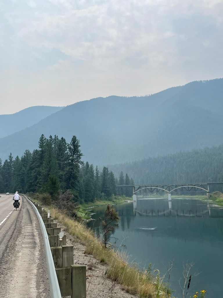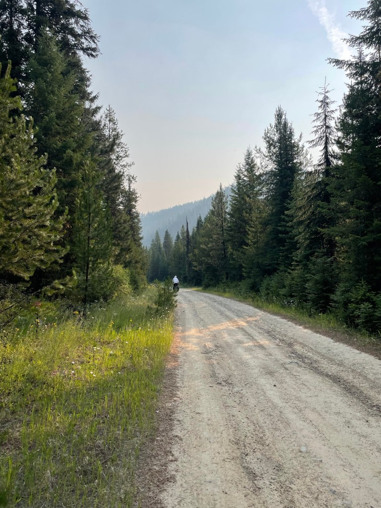 Chad is falling behind, I stop on a one lane bridge. One lane one lane. Pickup slows over it, pulls up about one meter away from me and stops. The drivers has got this gnarly long white beard, deep-set blue gray eyes and I think a handful of teeth. Maybe is in his 70s and looking bad — or in his 90s and looking good. For reasons about to be clear, his name is undoubtedly Skunk Hunter Sonny. Skunk Hunter Sonny — from the seat of his spurting and backfiring rust bucket pickup truck — tells me three things very specifically. One: it’s gonna be a hot one today. Two: he hunts skunks in his town, doesn’t kill them — releases them deep into the wild. I think he stresses deep because he knows that I just camped up the road. AND Three: wildfires are afoot with zero containment (which would explain the cascading gradients I see every along the mountain ridge lines this first two miles). He tells me down near Missoula. That’s southeast of me.