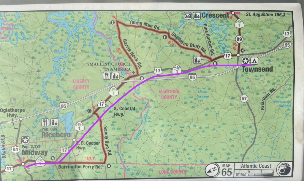 17 miles later I’m back on Highway 17, heading northeast — with the same headwind. Destination Savannah, hopefully. Wind wind wind. I’m done with it. I’m shortening the route. No more quiet road alternates, I’m going direct. It’s too windy to add mileage. Doesn’t seem to be any rain today though. At one point, I turn around to go back for a photo and really notice it how strong it’s blowing. If this wind were in the opposite direction I’d be able to coast the 70 miles into Savannah. What button this remote does that? Is there an app? Can I report this as trauma and shout down anyone who disagrees? I decide that’s the last time I turn back for anything. I’d rather not know how much easier it could be.