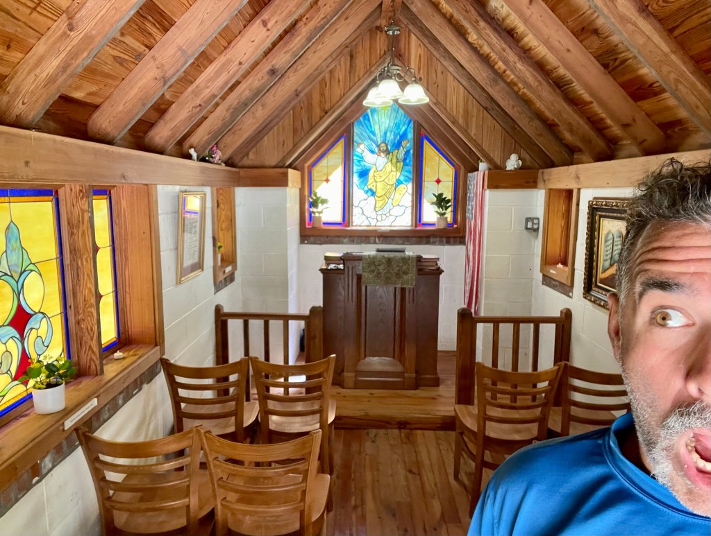 Smallest church and I am shocked, surprised and stupefied that I am not struck by lightning whenst entering. Probably because — spoiler alert — there is no more god in these manmade building than any other structure: casinos, crackdens and brothels including. Anyhoo I really really really wanted to get some of the old ass art juxtaposed alongside the stained glass, but I didn’t push my luck…