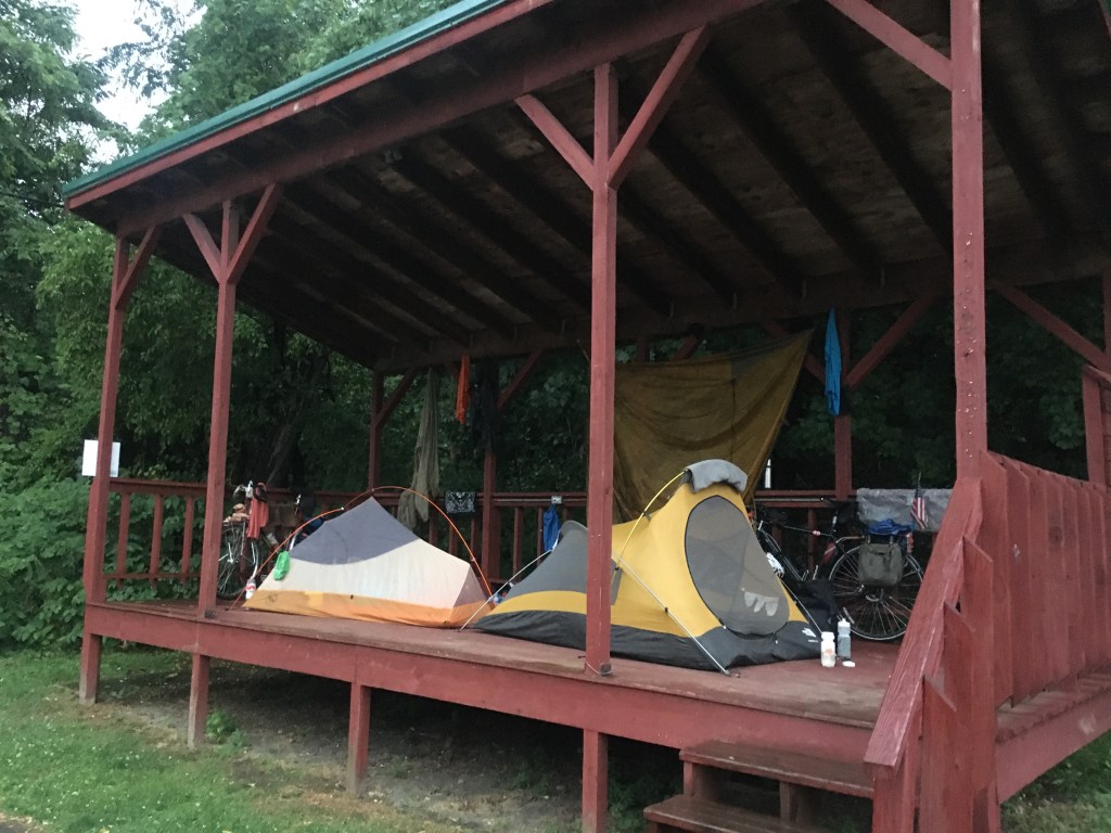 Waking up, I realize something. This is not the lean-to the signage directed us to. It’s a covered bandstand. Pretty much the same effect of getting us out of the downpour, but the actual lean-tos (theres 4 of them!) are 1/4 mile up – away from the highway and the train and the truck stop which woke me up at 2am and kept me up all night. I’m grateful we found anywhere at all to get out of the rain for the night, but wish there was more specific signage for bicyclists caught in storms. Aside from my sleeping bag and spare clothes, everything is thoroughly soaked. It put dry socks into wet sneakers. Wet shorts over dry cycling shorts. Makes it slightly chilly at 7am. That and no sleep make getting moving difficult this morning. I drink extra coffee and say hello to local passers by, who are probably wondering why in the fuck these two crazy guys slept on their bandstand.